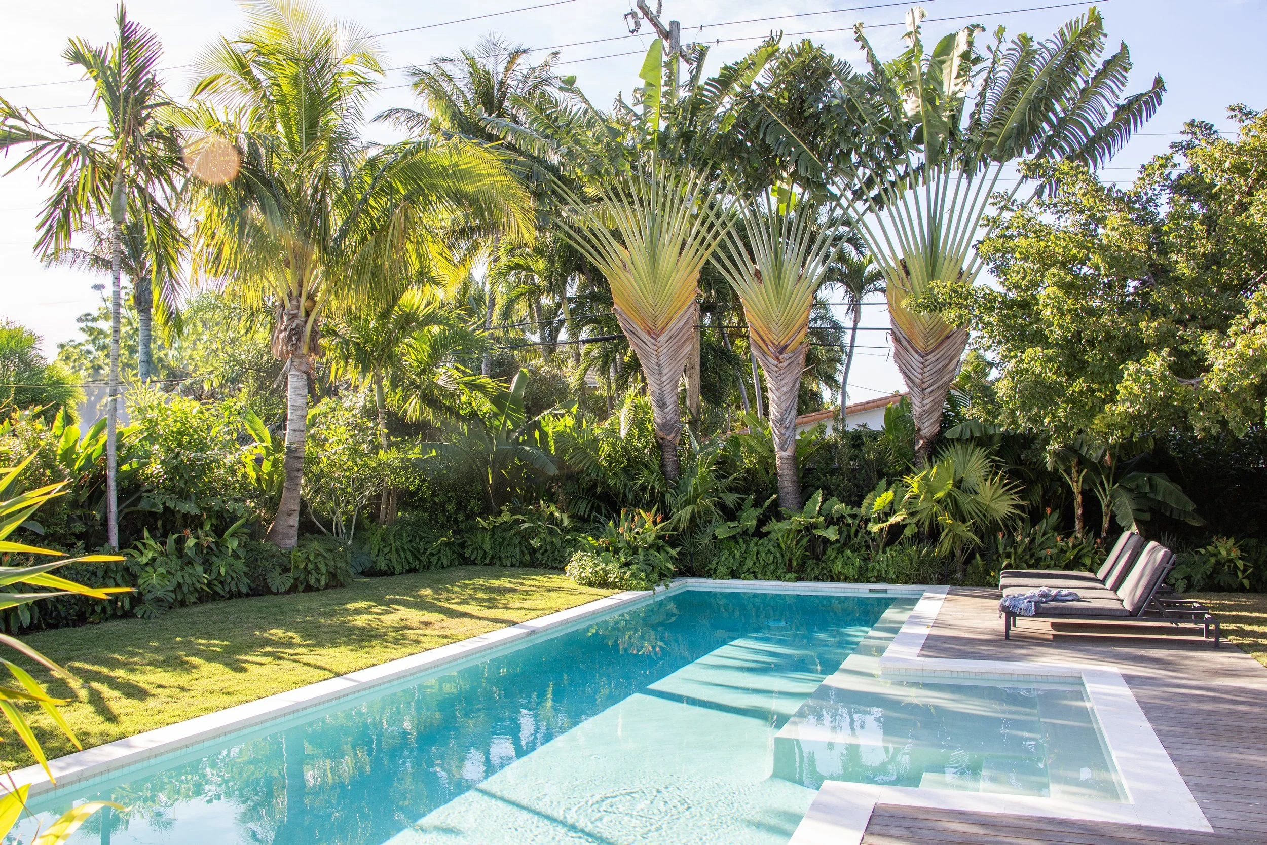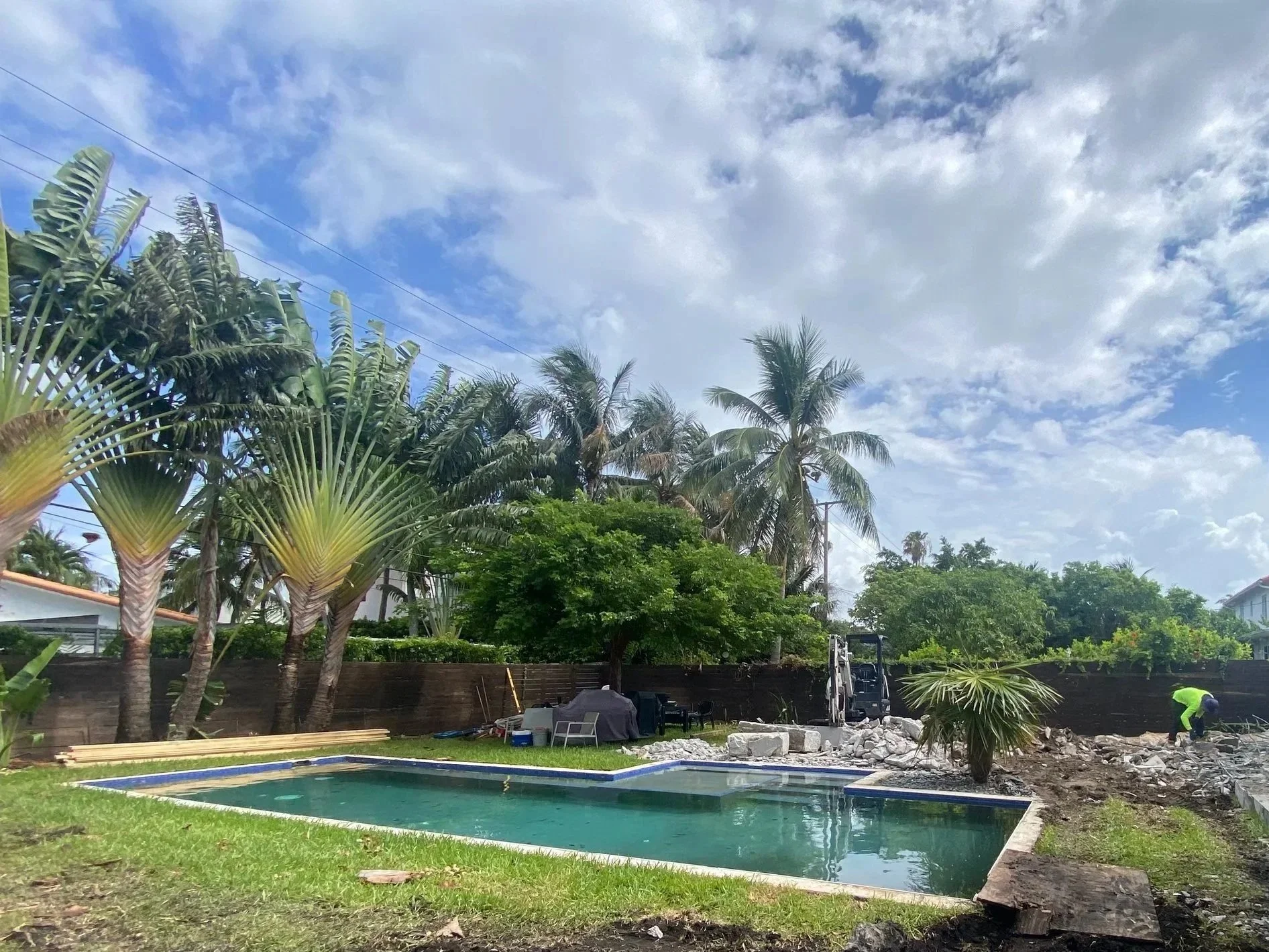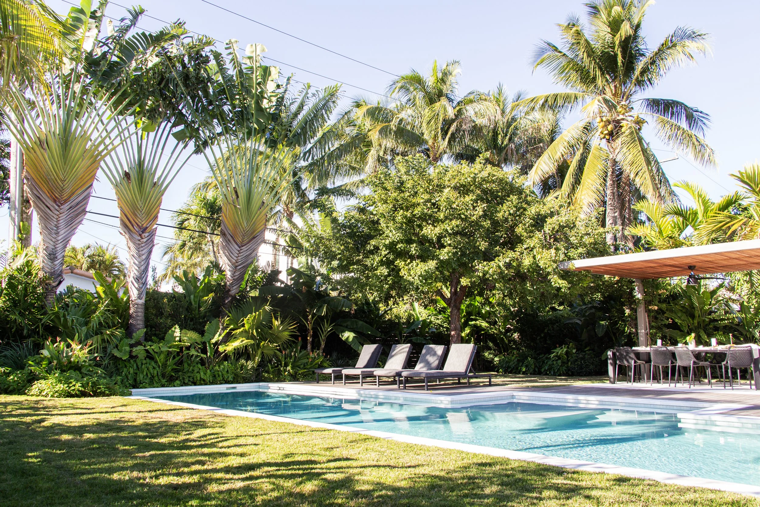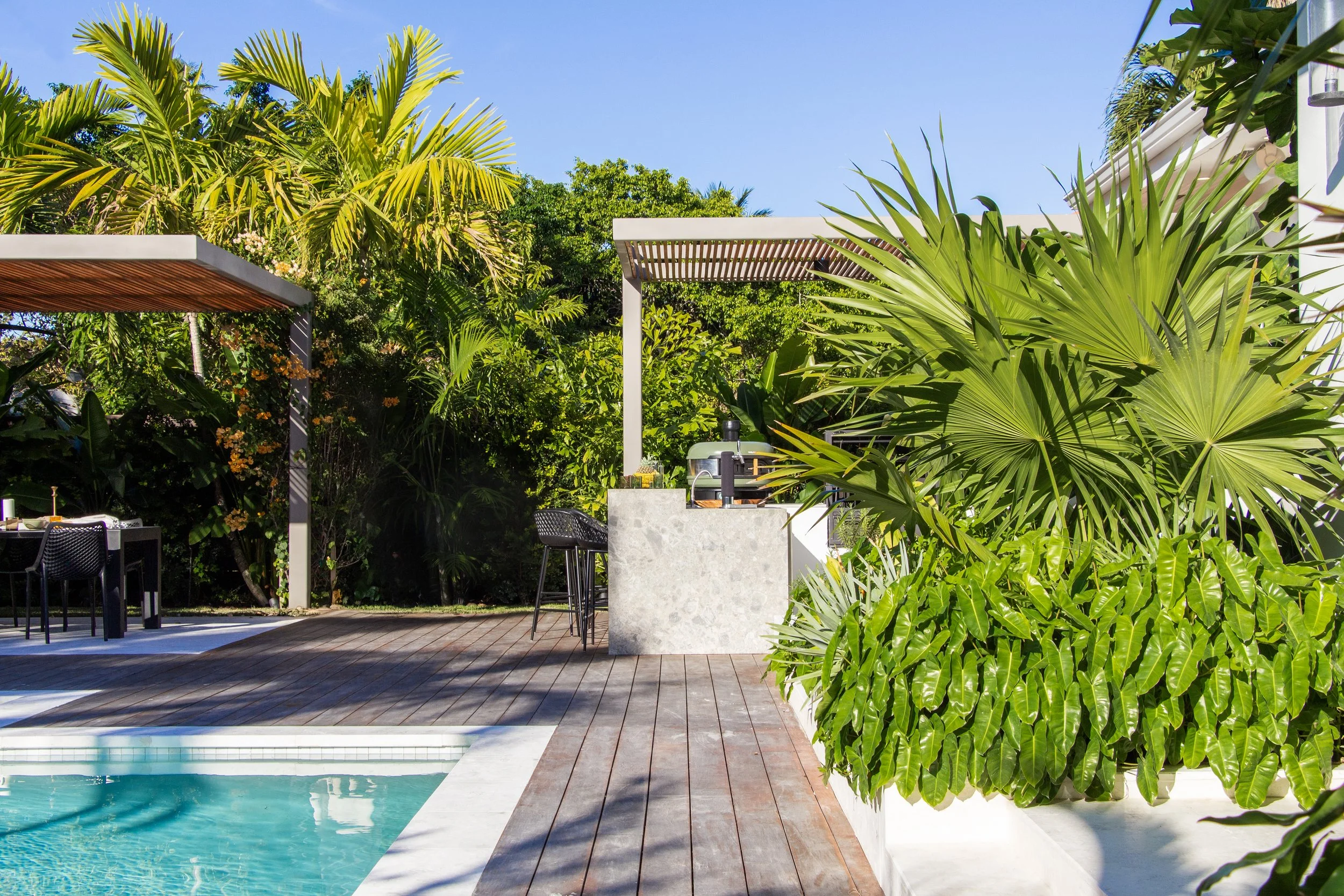 Explore the before-and-after photos showcasing a beautifully renovated pool with wooden deck, custom built pergolas, a fully equipped outdoor kitchen, a revamped driveway, and lush tropical landscape.