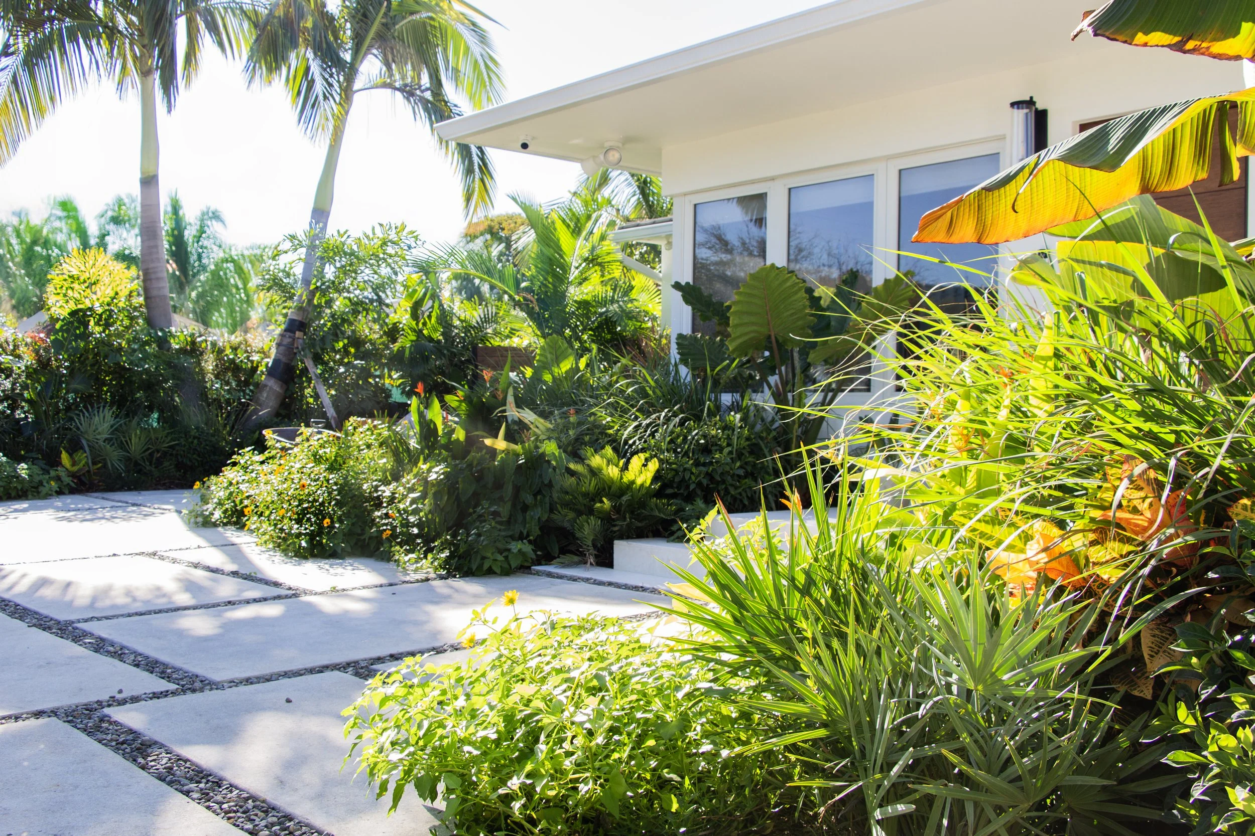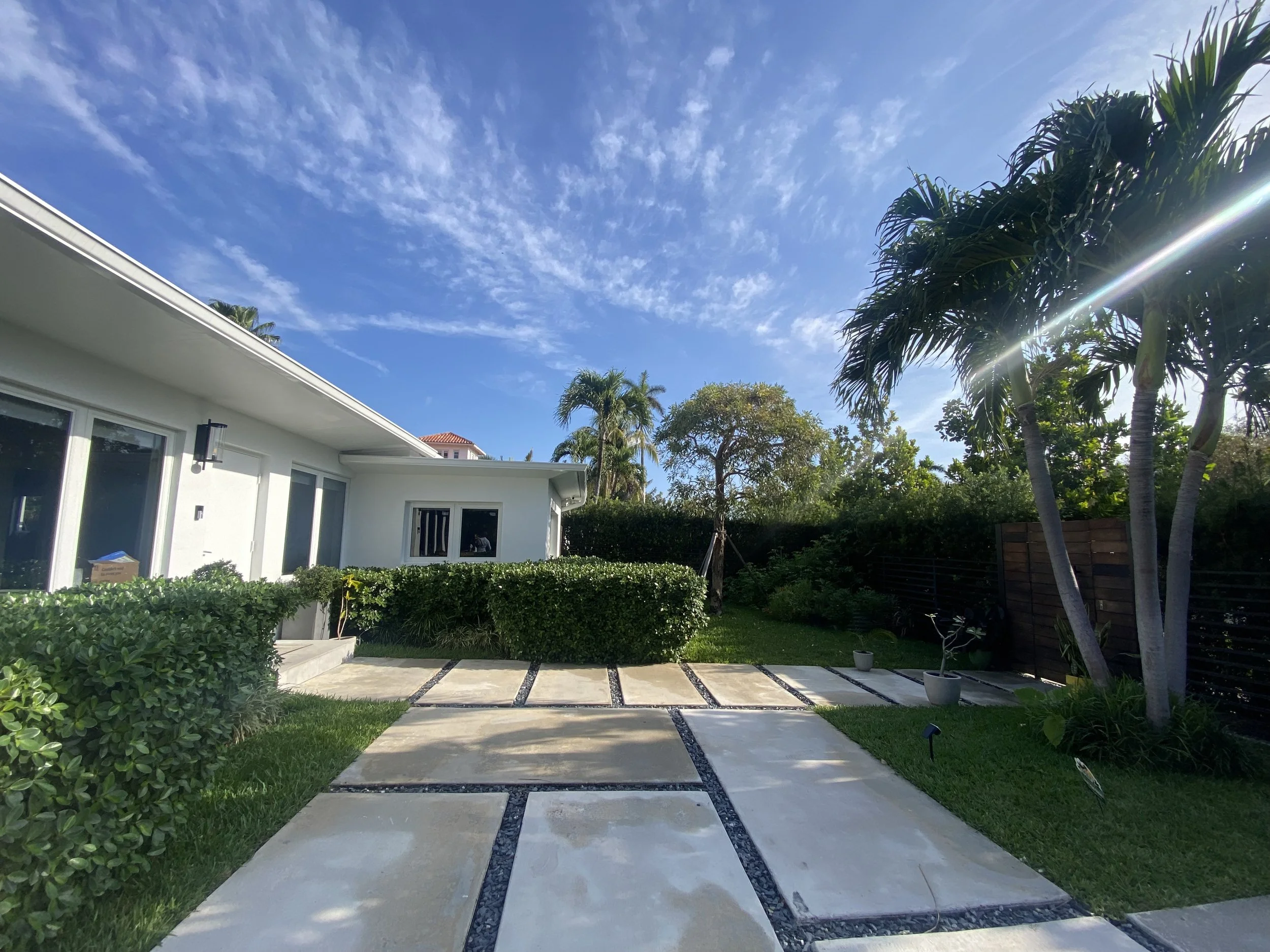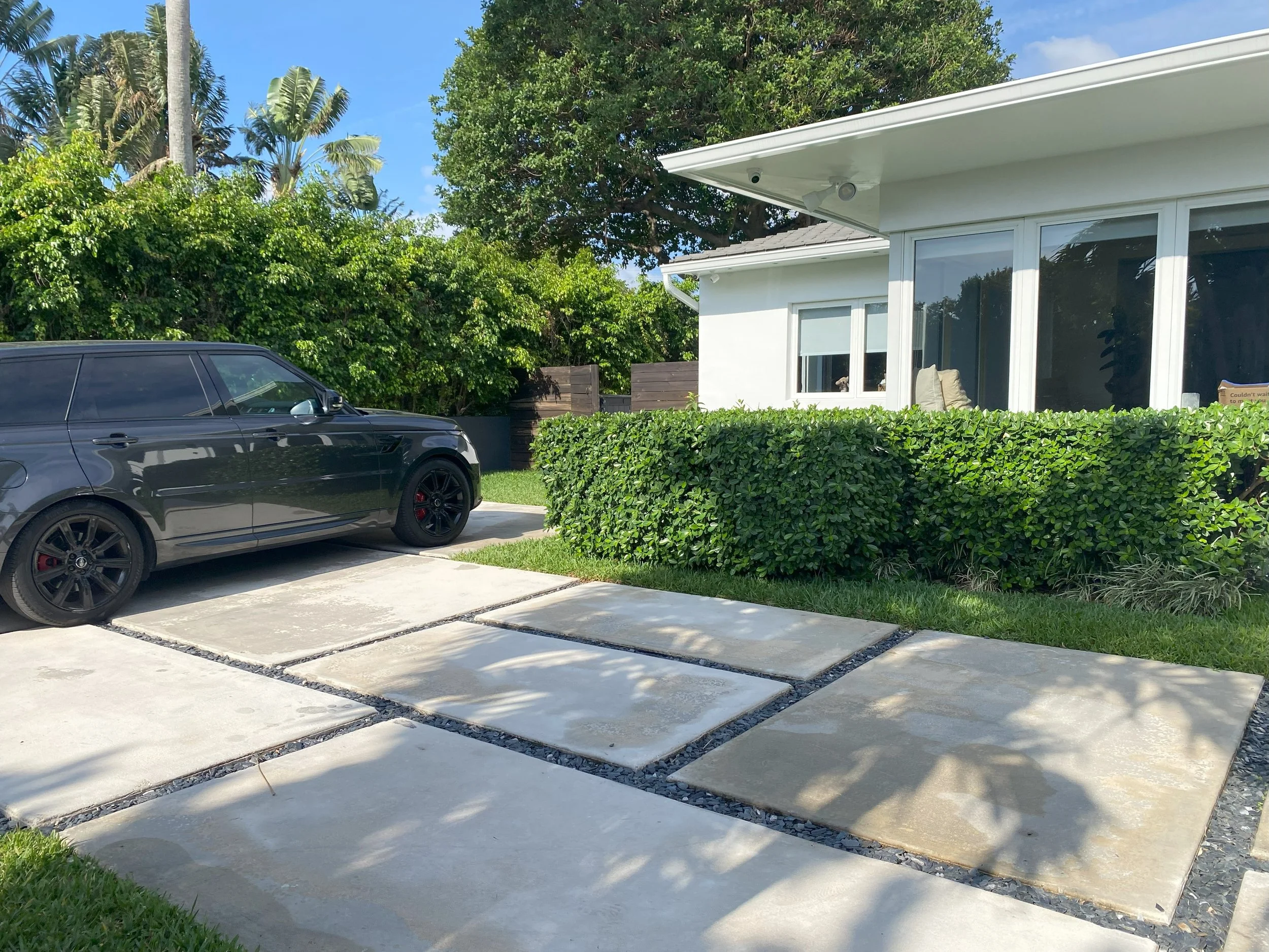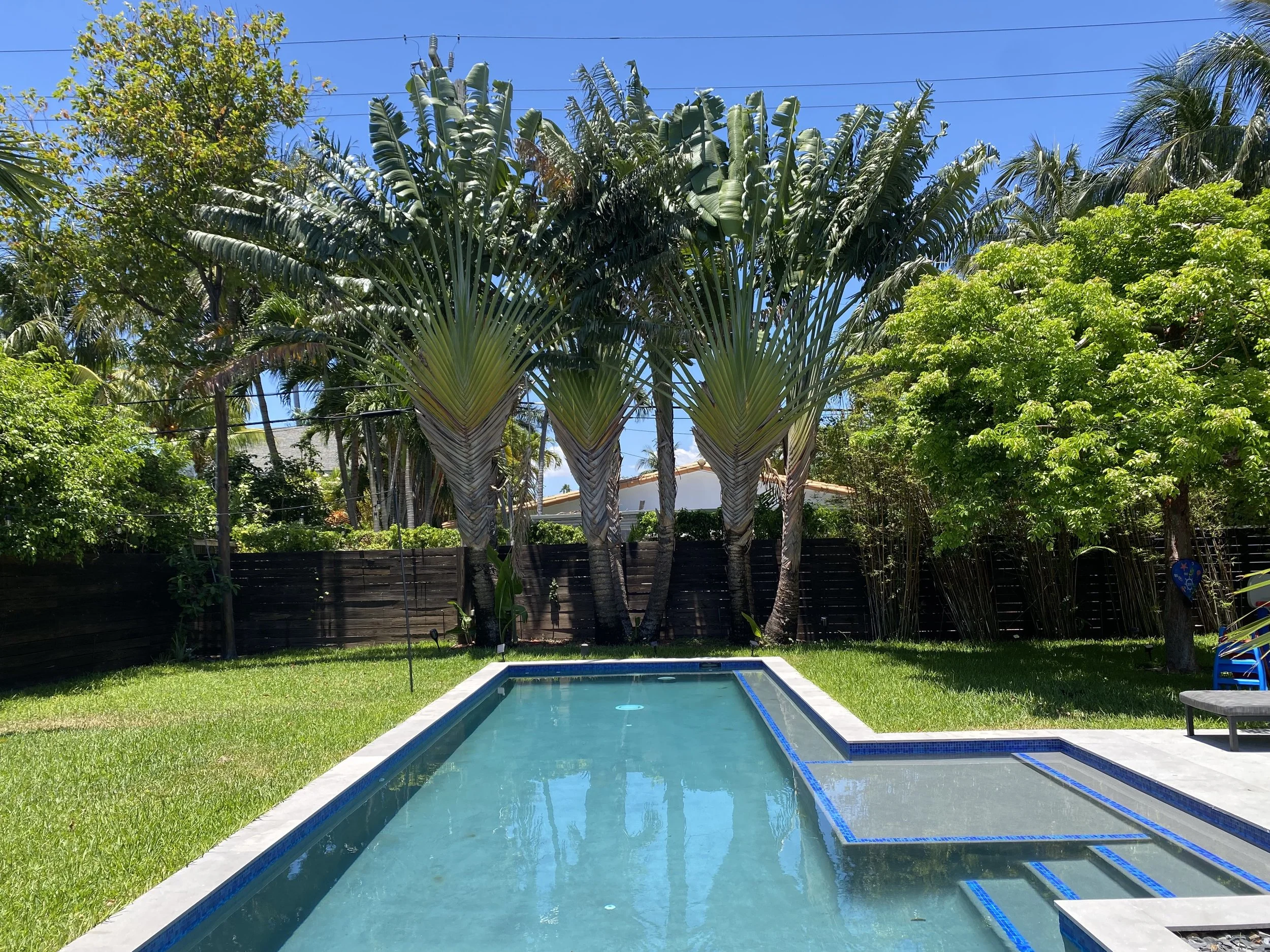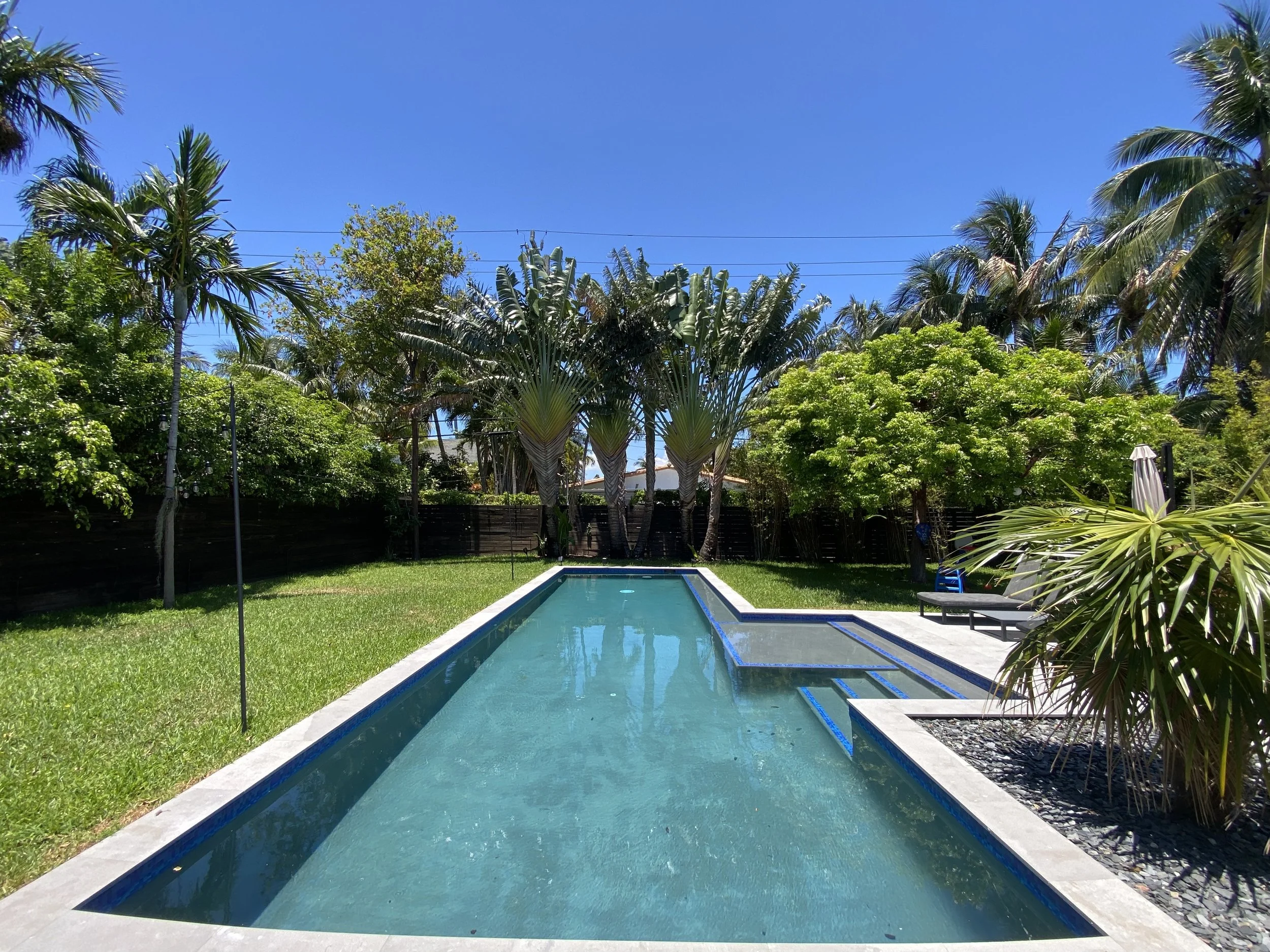 Explore the before-and-after photos showcasing a beautifully renovated pool with wooden deck, custom built pergolas, a fully equipped outdoor kitchen, a revamped driveway, and lush tropical landscape.